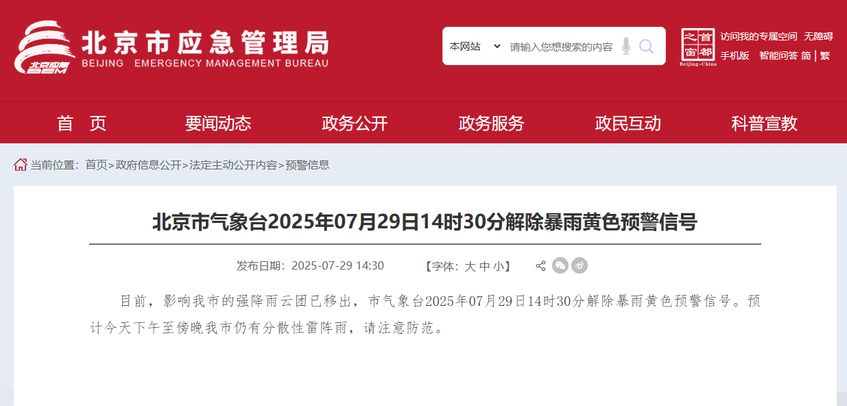 目前,影响北京市的强降雨云团已移出,市气象台2025年07月29日14时30分解除暴雨黄色预警信号。预计今天下午至傍晚北京市仍有分散性雷阵雨,请注意防范。